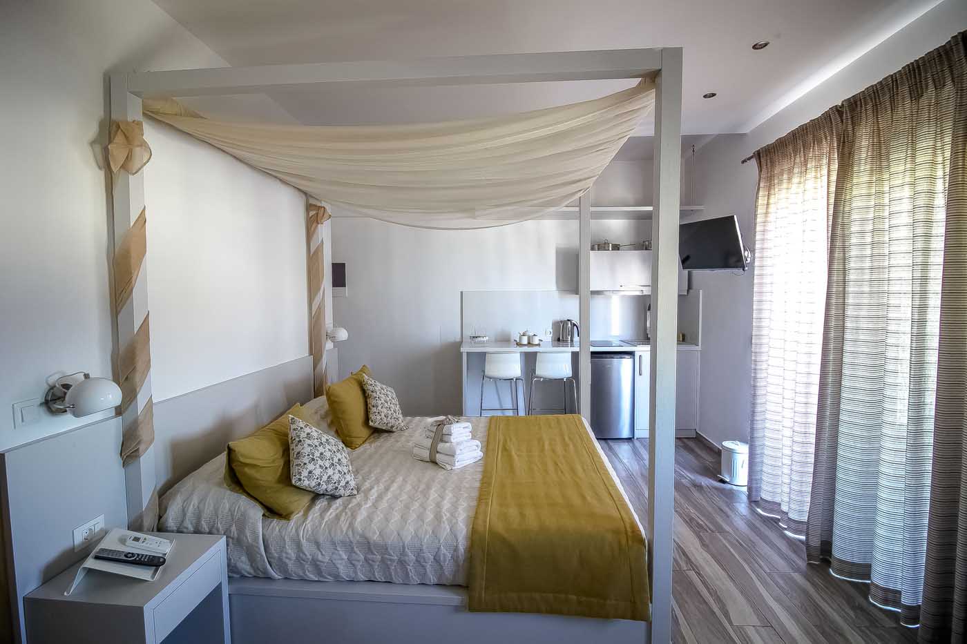 Room Description: Overlooking the Aegean Sea, Lindos and the Acropolis, this room opens out to a private balcony where you can enjoy your drinks or breakfast while viewing the village, Acropolis and the sea. Tastefully decorated, each comes with a flat-screen, satellite TV and a well-equipped kitchenette. A safe and a private bathroom with free toiletries and hairdryer are also provided.